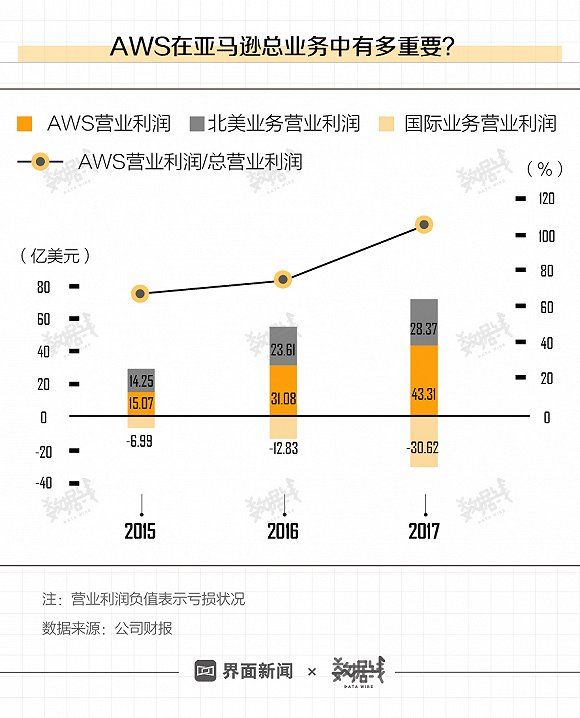 AWS业务对亚马逊有多重要?据亚马逊财报,2017年,AWS业务在总利润中的占比达到105.5%,在总业务中的利润占比最高。