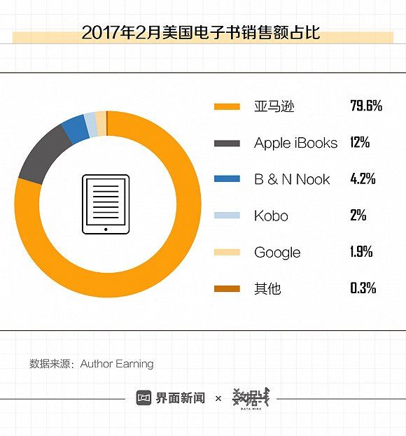 Auther Earning数据显示,在美国,亚马逊几乎主导了kindle所在的电子书领域,其电子书销售额占比达79.6%。