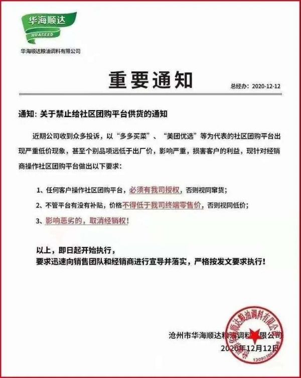 华海顺达的通知显示,收到多方投诉,以多多买菜、美团优选等位代表的社区团购平台出现严重低价现象,甚至个别产品远低于出厂价,影响严重,损害客户利益。后续,华海顺达回应“禁令”,强调此举是为了防止打破价格体系。