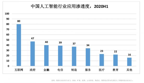 在 2020 年上半年,医疗行业在新冠肺炎疫情的影响下加速了人工智能应用的落地,在多方面取得了显著的成效,也促使医疗行业人工智能应用渗透度超过教育行业位列第七。