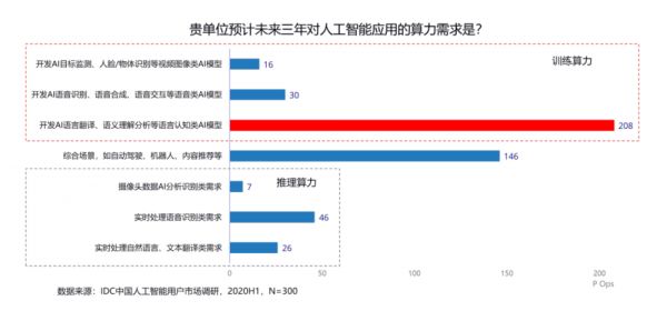 IDC进一步调研发现,未来三年,企业对于算力需求较为迫切的场景依然在语言认知类应用的训练上,对于该类 AI 模型训练的平均算力需求预计将达到 208P OPS,远高于其他应用负载;对于自动驾驶、机器人、内容推荐等综合场景的算力需求也相对较高,平均算力值将达到 146P OPS 左右。