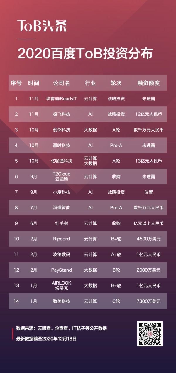 根据整理的数据显示,2020年度,百度在ToB投资市场总计出手14次,是2019年出手次的两倍多;投资金额方面,百度比2019年多出一倍不止,保守估计在40亿元人民币以上。