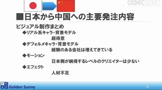 卖人设抽卡模式的兴盛又导致另一个现象,在今年九月日本举办的CEDEC 2020上,ゴールデンサニー董事长田村俊彦分享表示,从中国到日本的角色设计和剧本的订单正在不断增加,特别是角色设计方面。“中国的角色设计大多数头和身体都比较高,转化成二次元画风的话比较困难。中国对日本的要求是2D角色设计,在这个领域日本还处于中国的前列。剧本有时也会向日本订购。在中国,例如《三国志》、《水浒传》等以古典小说为基础的剧本很多,在游戏中很难表现出独特性和创意性,这时日本人的创意就能被运用其中。”