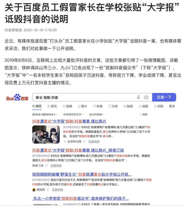 12月21日消息,抖音黑板报日前发布关于百度员工假冒家长在学校张贴“大字报”诋毁抖音的说明。抖音表示,近日,有媒体报道百度“打头办”员工假冒家长在小学张贴“大字报”诋毁抖音一案,也有媒体要求采访,我们对此事做一下公开说明。