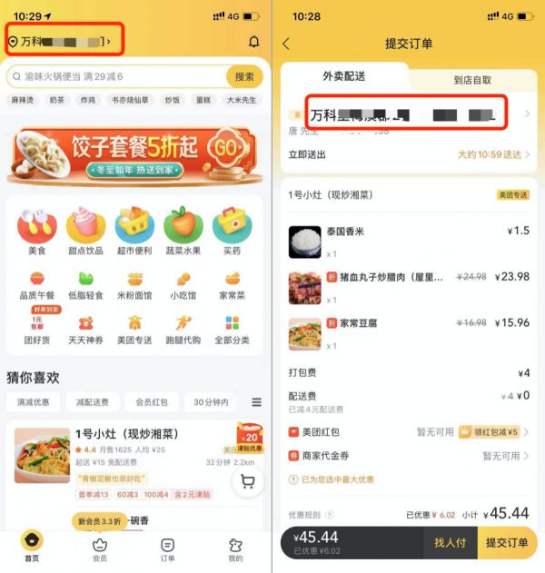 这里再说下,美团外卖的产品中有两个定位,一个叫「首页定位」,另一个叫「配送定位」,分别对应下图中的左图和右图。