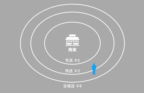 中心是商家,往外依次有三个圈,对应不同的距离以及配送服务类型和对应的价格。