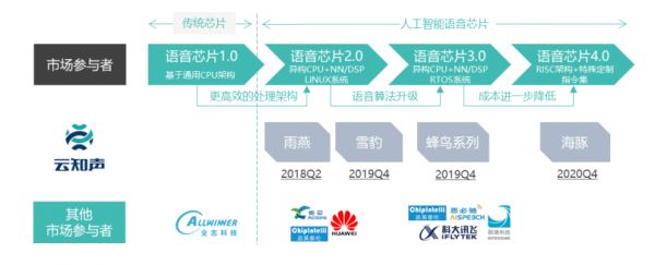 公开资料显示,云知声自2015年起,展开布局人工智能语音芯片,着手开发uDSP处理器和DeepNet IP技术,并在此基础上,于2018年率先交付人工智能语音芯片——“雨燕”,2019年陆续推出车规级芯片“雪豹”和面向家居领域的第二款升级版芯片“蜂鸟”系列,并启动具备“图像+语音”多模态交互功能的芯片“海豚”的研发,持续领跑同业……