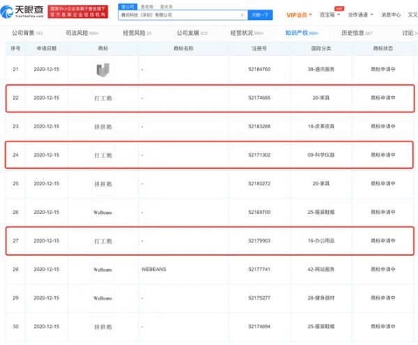 天眼查App显示,近日,腾讯科技(深圳)有限公司新增申请多条“打工鹅”的商标,商标涉及的国际分类包含科学仪器、家具、办公用品等,目前商标状态为“商标申请中”。