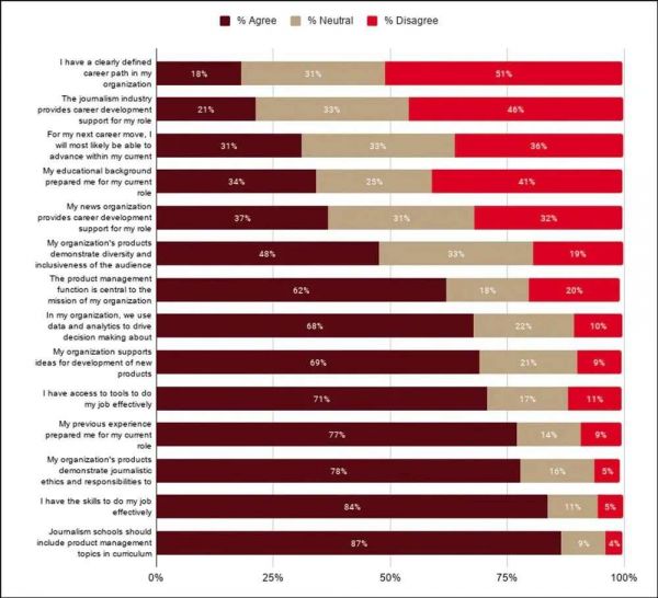 图注:2020年新闻产品社区现状(调查对象被问及他们是否同意这些关于产品工作的陈述,62%的受访者表示,产品管理是公司的“核心”,但对自己未来的职业机会和成长表示担忧)