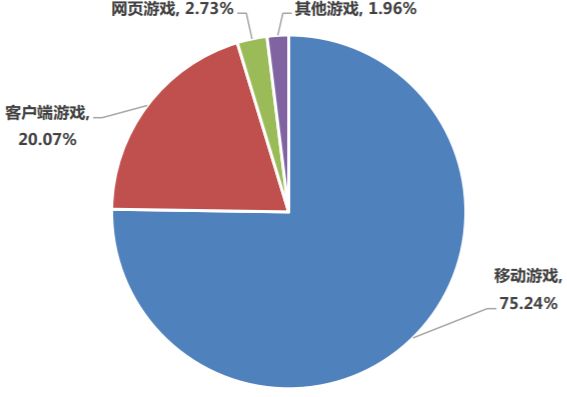 从细分市场来看,移动游戏市场已经成为我国游戏市场的绝对主力,收入占比超过四分之三。