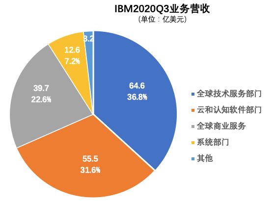 2020年三季度,IBM营收175.6亿美元,同比下降2.6%;净利润23亿美元,同比增长3%。四大业务中唯一增长的是营收占比31.6%的云和认知软件部,同比增长7%;其他三部门全球技术服务部、全球商业服务部与系统部,同比分别下降了4%、5%、15%。