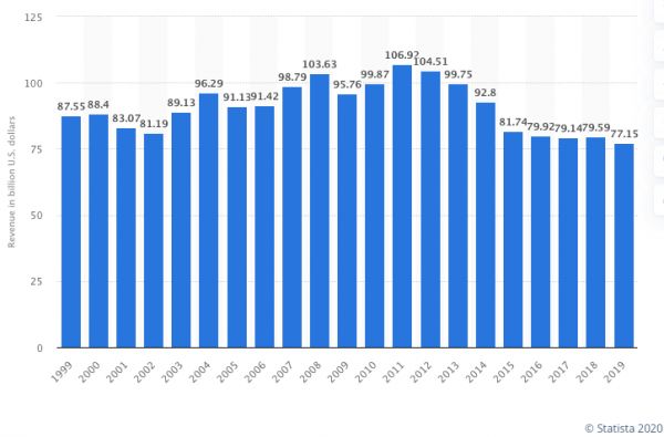 虽然三季度IBM云和认知软件部门保持同比增长,但与同期谷歌、亚马逊云服务的45%、29%增长相比,相差甚远。虽然三季度IBM营收微幅超过市场预期174.39亿美元,但长期下滑趋势没有丝毫逆转(下图为近二十年IBM整体营收)。