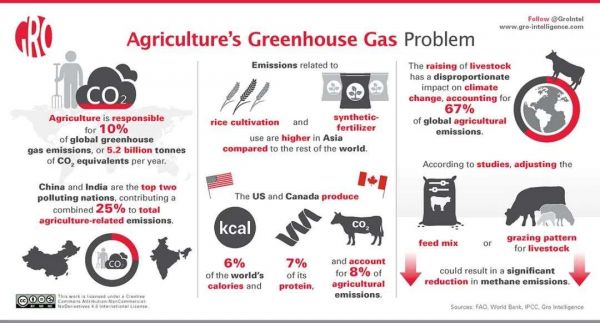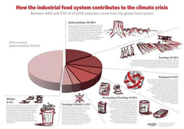 与农业与食品行业相关,按非盈利性组织GRAIN提供的研究称全球食物体系更为严重的算法,可能要为44%~57%的温室气体排放量负责。也就是如果管好全球食物系统,能实现食物体系内净零排放,则就完成了一半的任务。这一评估的口径是基于将占用土地于农耕或畜牧业导致的减林、农业生产自身温室气体排放、食品加工及包装领域、供应链流通系统中的耗能、冷藏食物耗能、以及食物垃圾产生的排放量,等等都计算在内。