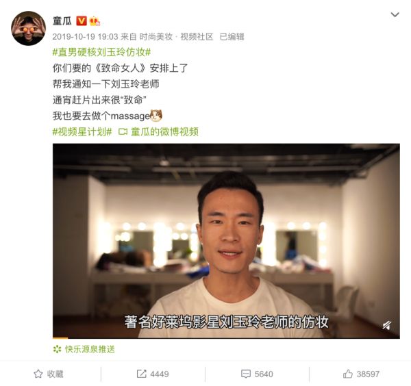 @童瓜 在2019年初正式开通微博,前几期的内容并未引起太大的反响,但在《致命女人》热播时经常有粉丝给@童瓜 留言说他长得像刘玉玲,于是他就萌生了做一期模仿影视片段内容的想法。最终《直男硬核刘玉玲仿妆》以强烈的反差感收获了263万播放量,也是@童瓜 第一条登上微博热搜的内容。