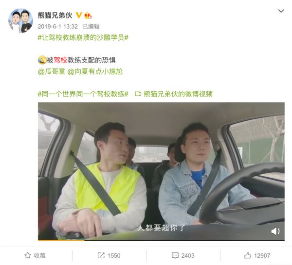 比如结合年轻人学车的话题,@向夏 和@童瓜 分别扮演学员和教练,制作了《驾校学车时的你》,将驾校教练的碎碎念和学员的紧张感诠释的淋漓尽致,吸引了数千网友在微博下留言吐槽,累计播放量高达880万。