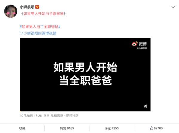围绕#张桂梅校长反对当全职太太# 的话题,@小狮很烦 在微博上发起并主持了话题#如果男人当了全职爸爸#,和@小水马c 一起制作《如果男人开始当全职爸爸,最后亮了》的视频,在微博上引发了深度讨论,话题阅读量高达7192万,视频播放量达到304万,并登顶当日的搞笑幽默榜。