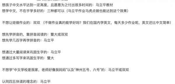 家长们对于各个不同教材的评价。来源:北美华人 e 网