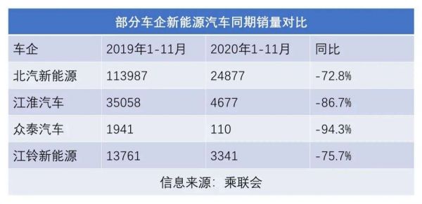 与之相对应的现象是,北汽、江淮、众泰、江铃等曾经的新能源汽车市场排头兵,均在2020年出现销量断崖式下滑。以北汽新能源为例,这家车企2019年销量达到15.8万辆顶峰,而2020年前11月销量则不足2.5万辆,同期降幅达78%。其他几家车企的情况,也无一不是如此。而同一时期,我国新能源乘用车整体销量增长5.9%。