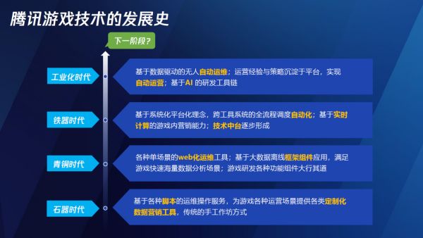 罗马不是一日建成的,我们也不是一天打造出这些能力,如果将腾讯游戏技术发展分成几个阶段,可以对应到人类发展的简史,石器时代,青铜时代,铁器时代等等。