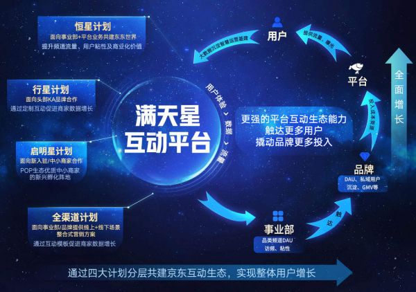 为了更好地满足各合作方的差异化需求,满天星平台面向京东各事业部、各层级的商家以及线下的门店都提供了不同层级的合作共建计划。例如恒星计划针对内部事业部及品类,在主站打造“东东世界”,把多个互动阵地,进行互动场的串联,提升频道流量、用户黏性及商业化价值;针对头部商家提出了行星计划,提供全链路互动营销服务、海量精准用户的流量扶持、社交关系数据,建立年框合作,在店铺的日常和促销节点扶持增长;启明星计划则主要针对优质的中小商家,利用互动场景的差异化,解决其在中心化场景中获取不到较多资源支持、难以自我成长的痛点;全渠道计划是基于LBS定位,针对线上和线下互动营销模式联动的模式,整体构建京东全渠道认知。四大计划统一在满天星平台的聚拢,形成彼此之间的底层支撑,共建京东互动生态,实现整体用户增长。