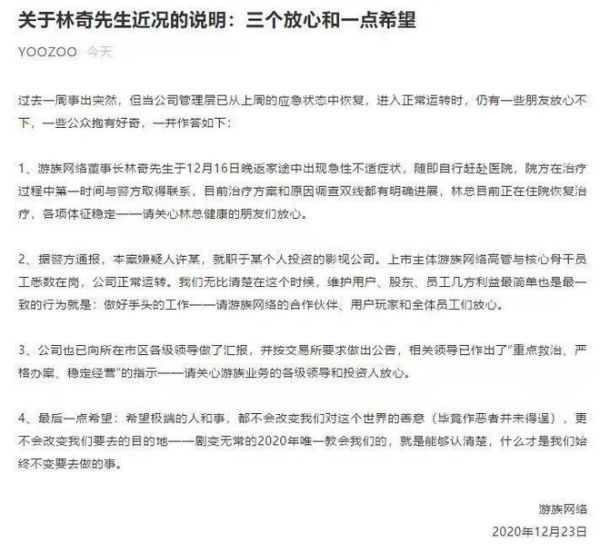 12月23日,游族网络成为舆论风暴中心,关于林奇疑似被投毒事件在社交媒体疯传。当晚,游族网络连发两次声明,表明林奇正在住院恢复治疗,生命体征稳定,同时上市公司经营一切正常。