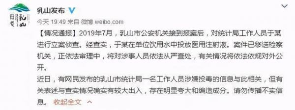 最近引发关注的一起事件是,山东乳山市统计局工作人员于某在单位饮用水中投放医用注射液。在网传信息中,于某投毒时间长达两年半。根据乳山市发布的消息,此案件已移送检察机关,正依法审理中,将对涉事人员依法从严查处。