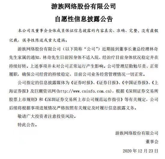 除了游族相关人士在朋友圈回应,每经记者注意到,23日晚间,游族网络连发两次公开回应。先是以公司公告发布称,上市公司近期接到董事长兼总经理林奇家属的通知,林奇日前因身体不适入院, 经治疗目前身体状况稳定并在持续好转。上述事项并未对公司正常运行产生影响,目前公司业务经营管理情况一切正常。