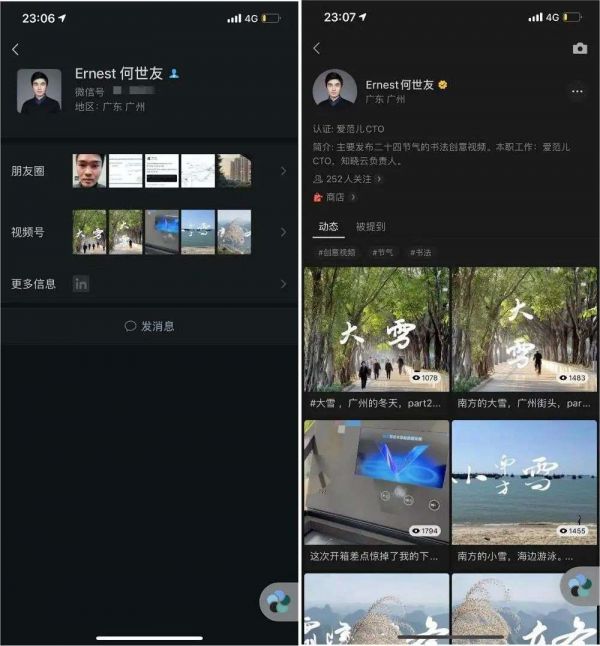 更进一步则是添加用户信息页也变了。除了本身有的朋友圈内容外,视频号也单列出来,用户点击即可进入主页。