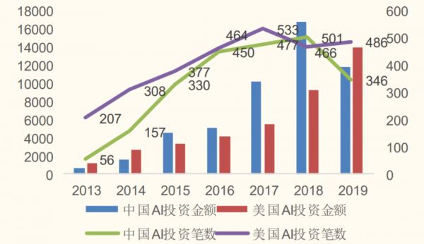 图:中美人工智能投资额与投资笔数(百万美元)