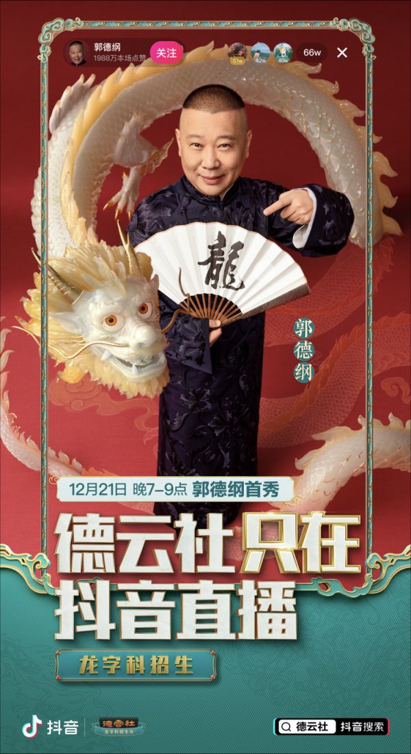 这次直播的主题——德云社龙字科招生,本身就是对“传承”很直观的一个表现。事实上与抖音的合作还未官宣前,郭德纲就曾透露这次招生的重要性,这一方面表现在龙字科将会是他最后一次大规模招生,另一方面,郭德纲还表示会亲自教这届徒弟。