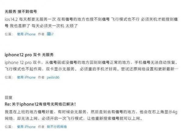 在Apple官网社区,也有果粉吐槽iphone12 Pro信号掉线的问题,还有用户表示,iPhone 12在WiFi和蜂窝数据之间切换时比较迟钝,有时会切换失败。