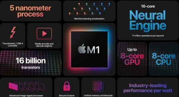 M1是一颗采用5nm工艺、包含160亿个晶体管的SoC,内置每秒可执行11万次操作的16核神经引擎,并展示出极具竞争力的能效比。在M1芯片支持下,新款Macbook Pro续航时间长达20小时。