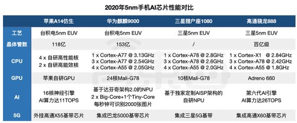 2020年9-12月,苹果A14、华为麒麟9000、三星猎户座1080、高通骁龙888这四大手机AI芯片先后亮相,组成了5nm量产落地的首发阵容。