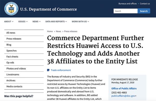 8月17日,美国再次收紧限令,宣布将华为38家子公司列入“实体清单”,并要求华为或子公司从美国以外的第三方公司购买芯片也需获得许可。