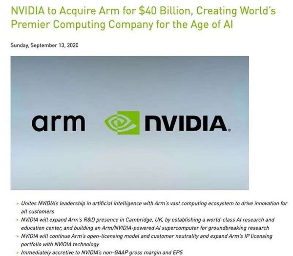 2020年9月,英伟达宣布将以400亿美元从日本软银集团手中收购英国芯片设计公司Arm。