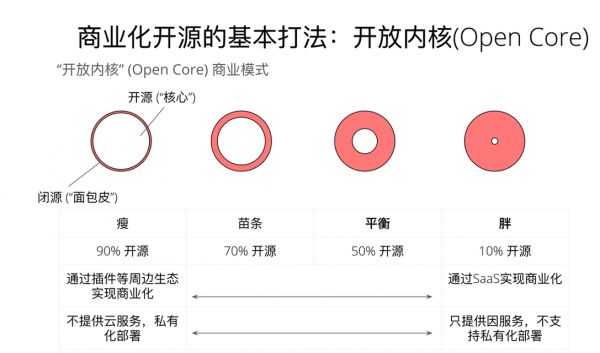 肖涵指出,包括Jina AI在内的大部分商业化开源公司(Commercial Open Source Software)目前都遵循开放内核的商业模式,即开源和闭源的结合,只免费提供核心程序。根据开源和闭源的比例不同衍生出不同的商业模式,对部分特性进行分级,针对不同等级采用不同的免费和收费模式。如90%开源通过插件等周边生态实现商业化,不提供云服务和私有化部署;10%开源则通过SaaS实现商业化,只提供因服务,不支持私有化部署。