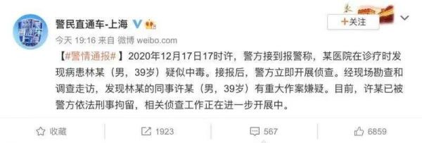 23日晚间,上海警方通报称,2020年12月17日17时许,警方接到报警称,某医院在诊疗时发现病患林某(男,39岁)疑似中毒。接报后,警方立即开展侦查。经现场勘查和调查走访,发现林某的同事许某(男,39岁)有重大作案嫌疑。目前,许某已被警方依法刑事拘留,相关侦查工作正在进一步开展中。