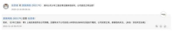 深交所的投资者互动平台上,游族在12月18日曾回复投资者:“近期有关于公司实控人林奇先生身体状况谣言不属实”。