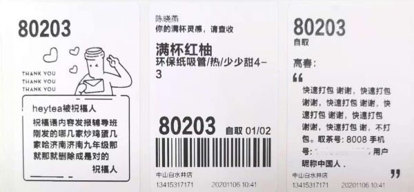 针对越来越多品牌的定制化需求,合阔智云在前端也推出了动态标签打印模块。这一功能在合阔智云服务的喜茶首先上线——就在前几日,“喜茶GO”微信小程序中上线“感恩杯贴”定制功能,这一功能背后便是由合阔提供支持。