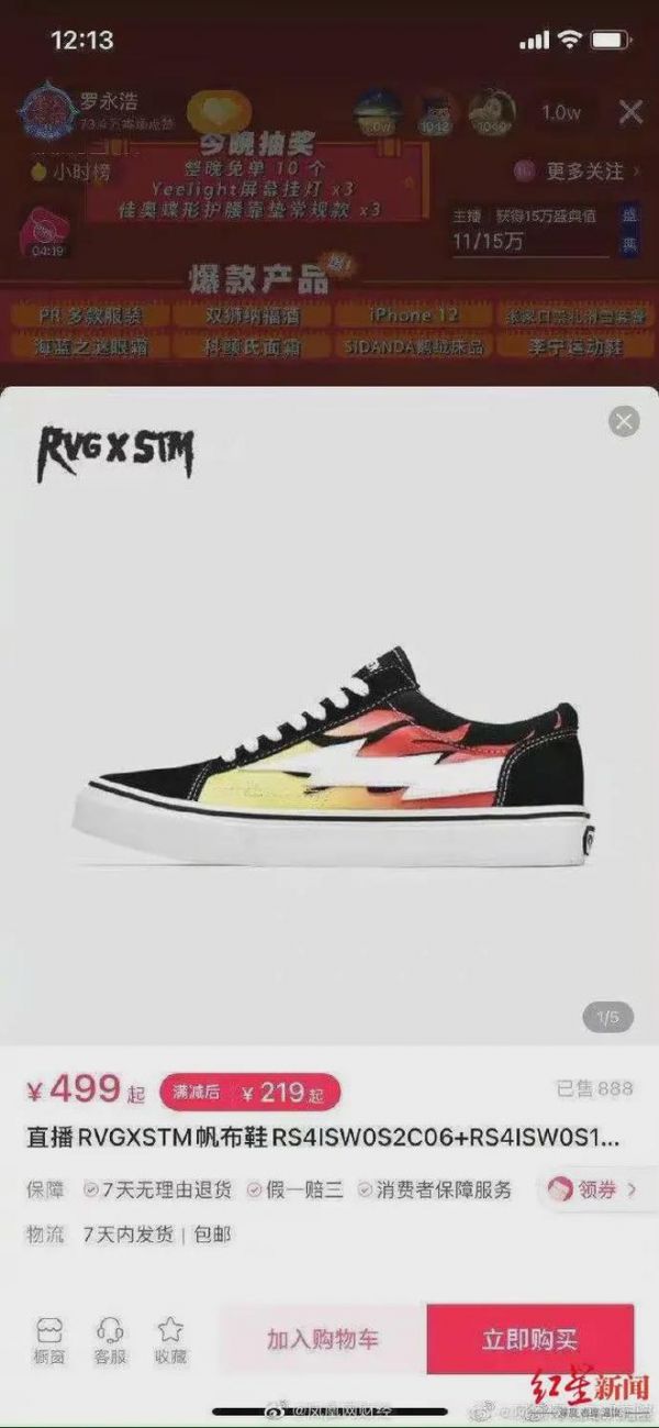 据了解,该鞋在抖音小店RVG X STM昊憬专卖店售卖,12月16日上架罗永浩直播间。数据显示,直播间券后价格219元,产品预估销量1516双,在直播间的销售额超过33万元。同时这款鞋也曾上架李诞直播间,预估销量256双。