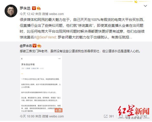 目前罗永浩还没有正面回应假鞋问题,红星新闻联系罗永浩微博进行询问,截至发稿未收到回复。不过今天中午罗永浩在微博称,很多媒体和网民的最大魅力在于,自己天天在100%有假货的电商大平台买东西,但直播行业出了些类似问题,他们就“惊诧莫名”,即使某些直播从业者在出问题时,比任何电商大平台出现同样问题时解决得都更快更好更有诚意,他们也继续惊诧莫名。