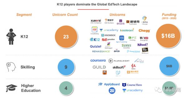 如果说独角兽只是衡量成功与否的一个标准,那么下面的数字在整个K-12中是令人印象深刻的,他们是市场中获得巨大投资额的公司。只有2家印度公司(36家EdTech独角兽)进入了榜单,但我敢打赌,到2025年,印度将拥有全球至少25%最具变革性的EdTech公司: