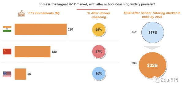 一个很好大市场例子,就是课后辅导市场。在入学率和参与(已经付费)的K-12人口中,这个市场远远大于中国或美国: