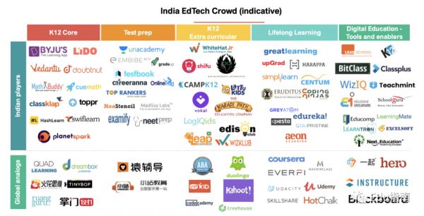 (1) 创新企业。印度企业家大胆、优先考虑本土企业,后考虑全球企业:像Byju's(备注:今年多轮融资、估值超百亿美元的印度k12考试教培公司)、Doutnut(备注:今年再融资1500万美元,数理学科答疑社区)、LeadSchool等创新型公司。Toppr、Unacademy(升学备考培训平台)、Vedantu(备注:今年融资1亿美元的k12在线辅导平台)。