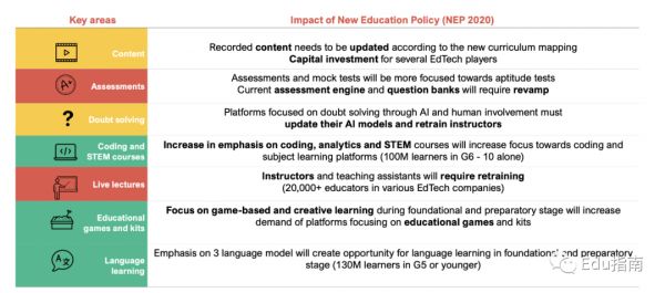 (3)政策。就像IT服务业一样,印度监管机构并没有干预教育科技行业的创新,同时也出台了诸如《国家环境政策2020》(NEP2020)这样的进步政策。也许实际只有30%的工作是在这一领域完成的,但这是一个很好的开端。