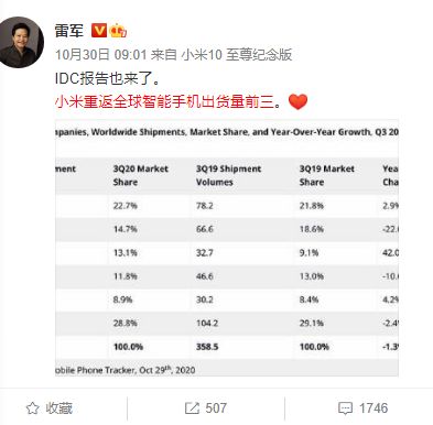 骁龙888官宣前,雷军10月30日在微博上晒出市场研究机构IDC最新报告,称“小米重返全球智能手机出货量前三”,在这份季度报告中,小米是增幅最大的企业,疫情期间逆势上扬。