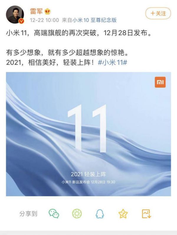 2020年到2021年新旧交替之时,雷军微博宣布,小米推出新机型“小米11”。这是小米一年来发布的第三款高端手机。