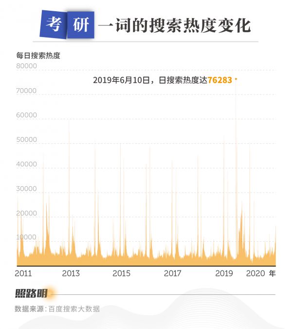 值得一提的是,2019年6月10日创下近年热度最高点,日搜索热度达76283。这个日子对考研人而言没有很特殊,但却是全国绝大多数地区结束高考的第二日。