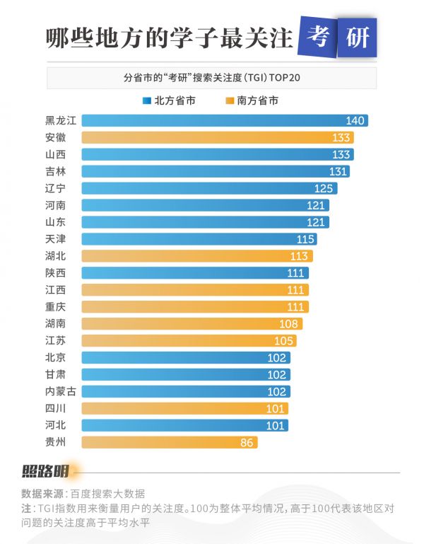 百度搜索大数据的结果显示,黑龙江是“考研”搜索关注度最高的地区。其次为安徽、山西、吉林、辽宁等省份。东北三省均进入前五。