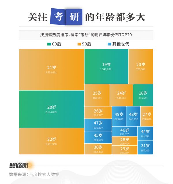 从搜索考研的用户年龄分布来看,95后已不再是考研主力,而逐渐由00后取代。